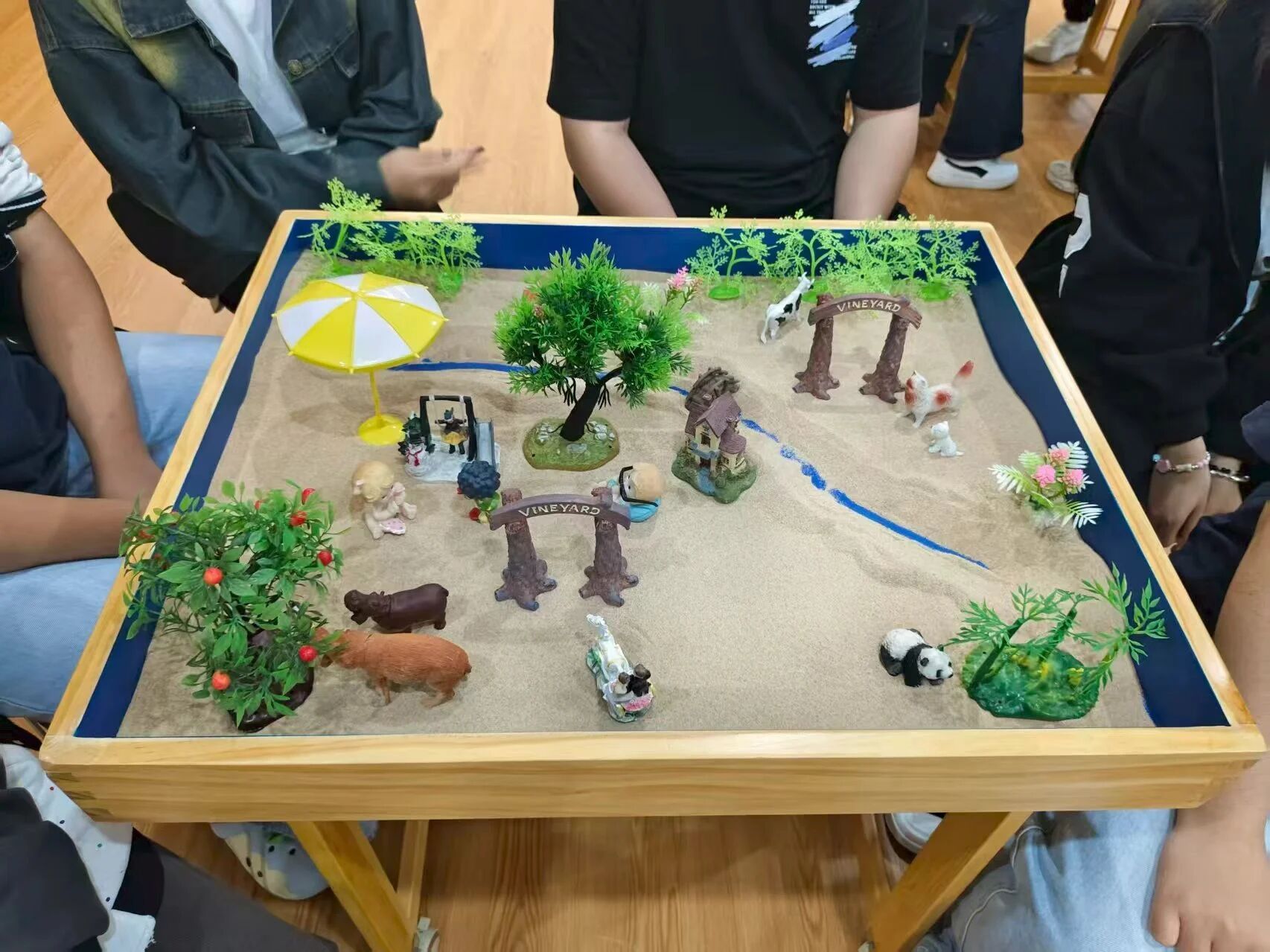 活动伊始的“破冰相识”环节,同学们通过“姓名接龙+兴趣标签”的小游戏快速打破陌生感。随后,沙盘进入个人体验环节,指导教师向同学们介绍了沙盘的基本理念,强调“没有对错、无需评判,只需跟随内心感受选择沙具、摆放造型”。同学们或轻拂沙粒勾勒地形,感受沙粒在指尖滑动,或挑选心仪的沙具,仔细观察不同沙具的大小与形态。指导教师不时以温和的提问引导同学觉察内心:“这个沙具给你带来什么感觉?”“你是怎样一眼之间就看到了它?”。