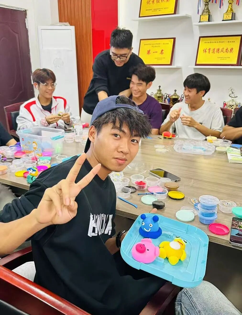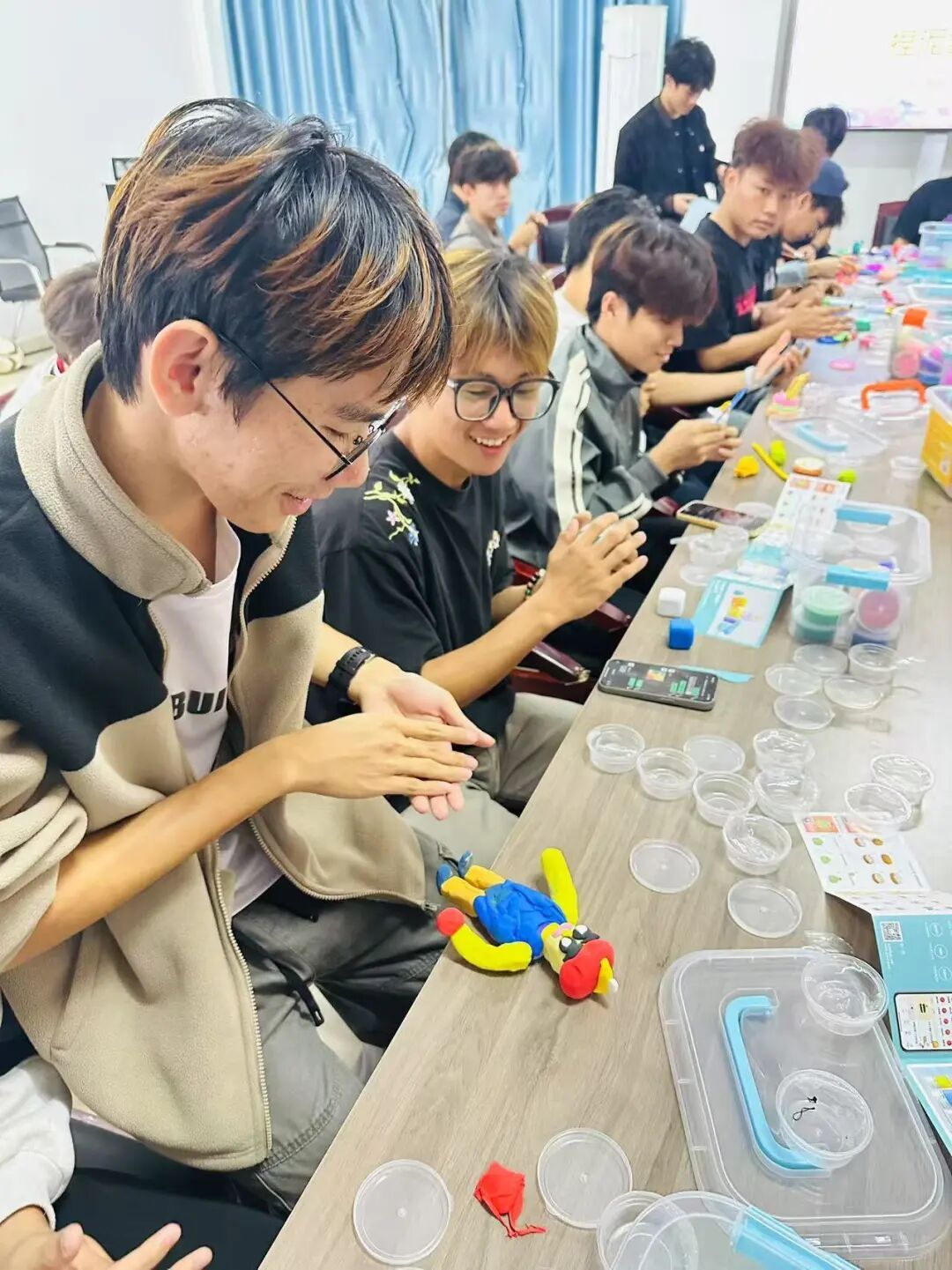 活动在轻松愉快的氛围中拉开序幕。现场准备了多种彩泥以及制作工具,在主持人的引导下,同学们逐步投入到捏塑创作中。活动中,大家专注构思、用心揉捏,将内心的情绪与想象转化为一个个独具个性的泥塑作品。有的同学捏出了生动可爱的小动物,有的创作出象征希望与宁静的植物与风景,现场气氛温馨而专注。